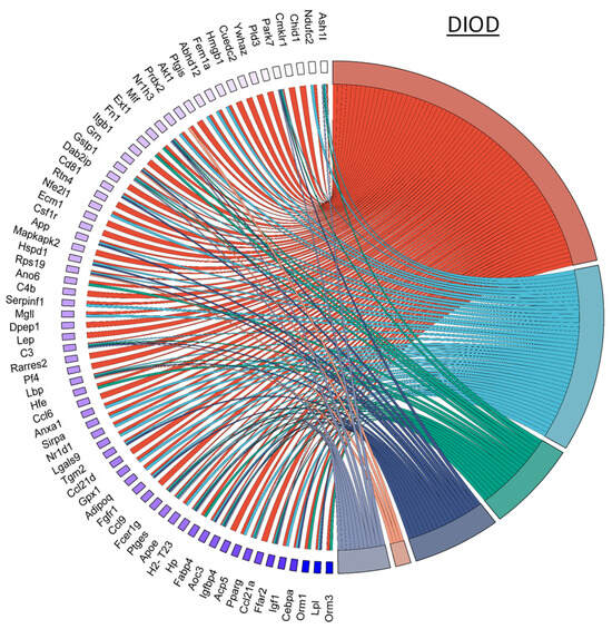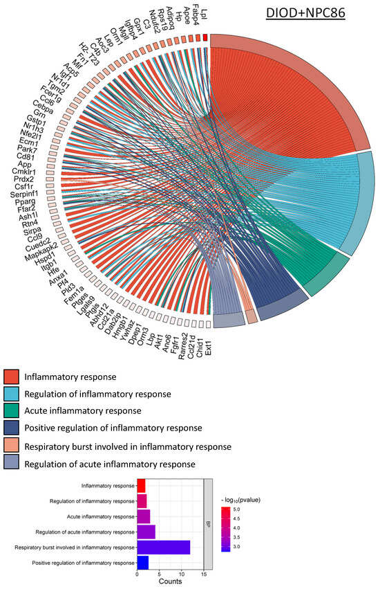 NPC86 also had a pronounced effect on inflammatory gene networks, as illustrated by chord diagrams depicting gene–pathway interactions related to inflammation (Figure 7). Compared to the untreated DIOD mice, the NPC86-treated mice exhibited a significant downregulation of genes involved in acute inflammation, respiratory burst, and immune activation. A pathway enrichment analysis confirmed that key inflammatory pathways, including cytokine signaling and stress-response pathways, were significantly repressed following NPC86 administration, suggesting that NPC86 exerts an anti-inflammatory effect in adipose tissue. Notably, NPC86 treatment significantly downregulated key inflammatory genes in adipose tissue, particularly those involved in acute inflammation, cytokine signaling, and immune activation.