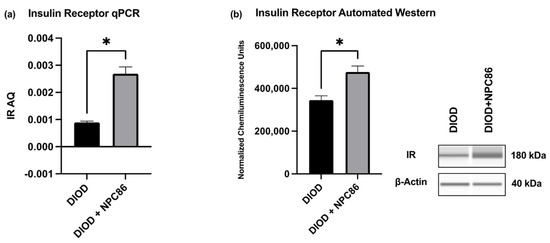 NPC86 enhances insulin receptor expression in DIOD mice. (a) Total RNA was extracted from the adipose tissue of DIOD and DIOD + NPC86 mice (200 ng/kg b.w.). Real-time qPCR was performed in triplicate using SYBR Green to measure the absolute quantification of IR expression and normalized to GAPDH. A statistical analysis was performed in GraphPad Prism using an unpaired t-test (n = 3 per group). The data are presented as mean ± SEM; * p < 0.05. (b) An automated Western blot analysis using JESS was performed on adipose tissue from DIOD and DIOD + NPC86 (200 ng/kg b.w.) mice using antibodies against IR and β-actin. Representative blots and the quantification of chemiluminescence units are shown. A statistical analysis was performed in GraphPad Prism using an unpaired t-test (n = 3 per group). The data are presented as mean ± SEM, with statistical significance indicated as * p < 0.05.