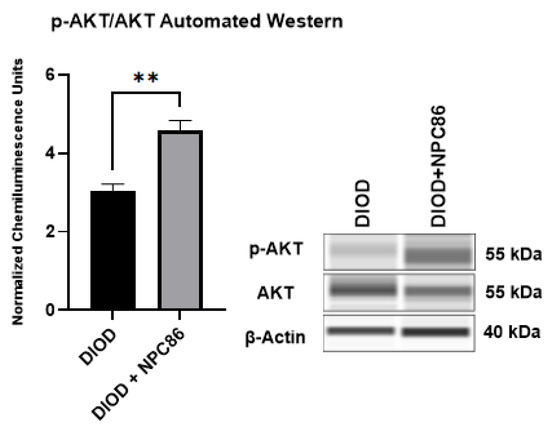 NPC86 treatment increases pAKT/AKT in DIOD mice. An automated Western blot analysis using JESS was performed on adipose tissue from DIOD and DIOD + NPC86 mice using antibodies against p-AKT (Ser473), total AKT (1/2/3), and β-actin. The phosphorylated AKT to total AKT (p-AKT/AKT) ratio is significantly elevated following NPC86 treatment (1 μg/kg b.w.). Representative blots and quantification are provided. A statistical analysis was performed in GraphPad Prism using an unpaired t-test (n = 3 per group). The data are presented as mean ± SEM, with statistical significance indicated as ** p < 0.01.