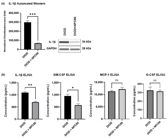 NPC86 reduces IL-1β protein levels. (a) An automated Western blot analysis using JESS was performed on adipose tissue from DIOD and DIOD + NPC86 (500 ng/kg b.w.) mice using antibodies against IL-1β and GAPDH. Representative blots and quantification are displayed. A statistical analysis was performed in GraphPad Prism using an unpaired t-test (n = 3 per group). The data are presented as mean ± SEM, with statistical significance indicated as *** p < 0.001. (b) The serum concentrations of IL-1β, GM-CSF, G-CSF, and MCP-1 were measured by ELISA in DIOD and DIOD + NPC86 (500 ng/kg and 1 μg/kg b.w.) mice. A statistical analysis was performed in GraphPad Prism using an unpaired t-test (n = 3 per group). The data are presented as mean ± SEM, with statistical significance indicated as * p < 0.05, ** p < 0.01.
