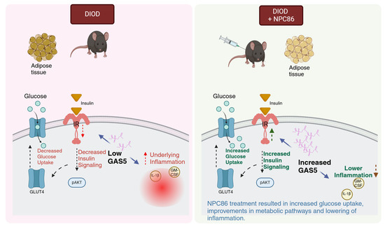 Glucose tolerance tests (IPGTT) further validated these findings, showing that NPC86-treated DIOD mice exhibited improved glucose clearance compared to untreated DIOD mice. These results suggest that NPC86 promotes insulin responsiveness by increasing gas5 levels and increasing insulin receptor activity in DIOD mice.