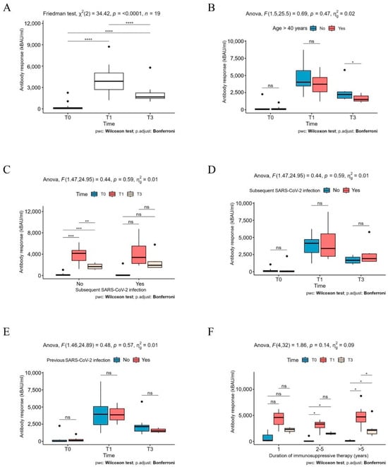 Humoral immune response in the patient cohort. (A) Serum titer of anti-SARS-CoV-2 antibodies (kBAU/mL) in patients at the indicated time points (T0, T1, T3); (B) serum titer of anti-SARS-CoV-2 antibodies (kBAU/mL) in patients: (B) aged ≤40 years-old or >40 years old; (C,D) who experience or not a subsequent SARS-CoV-2 infection at the indicated time points (T0, T1, T3); (E) who experienced or not a previous SARS-CoV-2 infection at the indicated time points (T0, T1, T3); (F) undergoing immunosuppressive regimen for 1, or 2–5 or >5 years at the indicated time points (T0, T1, T3). One-way repeated-measures non-parametric ANOVA (A), the Friedman test, and two-way mixed ANOVA (B–F) were conducted to evaluate the effects of time and grouping variables. Pairwise comparisons were carried out using the Wilcoxon rank sum test with p-values adjusted using the Bonferroni method. Significance levels were defined as follows: ns (not significant) p ≥ 0.05; * p < 0.05; ** p < 0.01; *** p < 0.001; **** p < 0.0001.