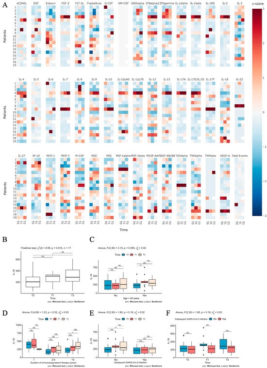 Circulating immune factors in the patient cohort. (A) Heatmap of 48 serum analytes in patients (rows) at the indicated time points (T0, T1, T3) (columns). Colors represent the standardized values (z-scores) for each biomarker, where white indicates values close to the overall mean, while red and blue represent values, respectively, higher and lower than the mean. (B) Serum level of circulating IL-8 (pg/mL) at the indicated time points (T0, T1, T3). Serum level of circulating IL-8 (pg/mL) in patients: (C) aged ≤40 years old or >40 years old; (D) undergoing immunosuppressive regimen for 1, or 2–5 or >5 years at the indicated time points (T0, T1, T3); (E,F) who experience or not a subsequent SARS-CoV-2 infection at the indicated time points (T0, T1, T3). One-way repeated-measures non-parametric ANOVA (B), the Friedman test, and two-way mixed ANOVA (C–F) were conducted to evaluate the effects of time and grouping variables. Pairwise comparisons were carried out using the Wilcoxon rank sum test with p-values adjusted using the Bonferroni method. Significance levels were defined as follows: ns (not significant) p ≥ 0.05; * p < 0.05; ** p < 0.01.