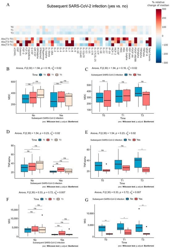 CCL22/MDC, TNF-alpha and MIG levels in patients. (A) Heatmap of pairwise differences in 48 serum analytes (rows) at individual time points and absolute deltas between time points (T1–T0; T3–T1; T3–T0) (columns) comparing patients who experienced a subsequent SARS-CoV-2 infection to those who did not. Differences are shown as the percentage relative change in median values. White indicates minimal differences between the two groups at a given time point or time delta and analyte, while red and blue represent relatively higher or lower median values, respectively. (B,C) Serum level of circulating CCL22/MDC (pg/mL)at the indicated time points (T0, T1, T3) in patients who experience or not a subsequent Sars-CoV-2 infection. (D,E) Serum level of circulating TNF-alpha (pg/mL) at the indicated time points (T0, T1, T3) in patients who experience or not a subsequent Sars-CoV-2 infection. (F,G) Serum level of circulating MIG (pg/mL) at the indicated time points (T0, T1, T3) in patients who experience or not a subsequent Sars-CoV-2 infection. Two-way mixed ANOVA (B–G) were conducted to evaluate the effects of time and grouping variables. Pairwise comparisons were carried out using the Wilcoxon rank sum test with p-values adjusted using the Bonferroni method. Significance levels were defined as follows: ns (not significant) p ≥ 0.05; * p < 0.05; ** p < 0.01.