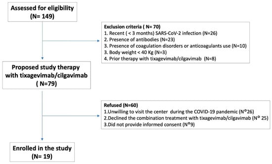 A prospective interventional study was conducted from May to June 2023, involving lung transplant recipients under active monitoring at the Transplant Center of the University Hospital of Padova. All eligible patients were contacted via telephone and invited to participate in this study. Inclusion criteria required participants to be able to visit the transplant center during the COVID-19 pandemic, have no active or opportunistic infections, consent to undergoing blood tests as part of their follow-up, and provide written informed consent. Exclusion criteria included refusal of intramuscular injections, a body weight below 40 kg, a recent SARS-CoV-2 infection (within the last three months), or coagulation disorders preventing the safe discontinuation of anticoagulant therapy. In total, 19 patients met the eligibility criteria and were enrolled. Each participant was clinically assessed for six months following the administration of tixagevimab/cilgavimab. This study officially concluded on 30 January 2023, coinciding with the completion of the six-month follow-up for the last enrolled patient. A graphical summary is provided in Figure 4.