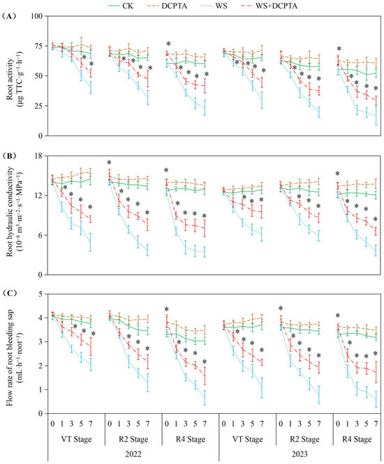 Responses of root activity (A), root hydraulic conductivity (B) and flow rate of bleeding sap (C) to post-tasseling waterlogging and exogenous DCPTA regulating effect. The data represent the means of independent measurements with five replicates, and the standard deviations are indicated by the vertical error bars. “*” on the bars indicates a significant difference at p < 0.05 (LSD test) between the waterlogging and waterlogging with DCPTA at each time point.