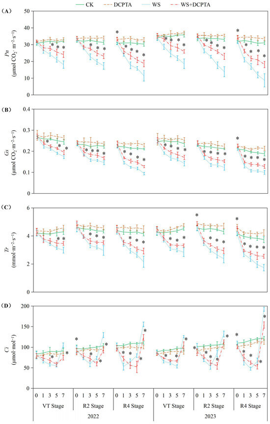 Responses of leaf Pn (A), Gs (B), Tr (C) and Ci (D) to post-tasseling waterlogging and exogenous DCPTA regulating effect. The data represent the means of independent measurements with five replicates, and the standard deviations are indicated by the vertical error bars. “*” on the bars indicates significant difference at p < 0.05 (LSD test) between the waterlogging and waterlogging with DCPTA at each time point.