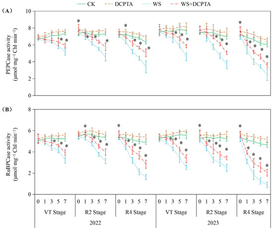 Responses of activities of PEPCase (A) and RuBPCase (B) to post-tasseling waterlogging and exogenous DCPTA regulating effect. The data represent the means of independent measurements with five replicates, and the standard deviations are indicated by the vertical error bars. “*” on the bars indicates significant difference at p < 0.05 (LSD test) between the waterlogging and waterlogging with DCPTA at each time point.