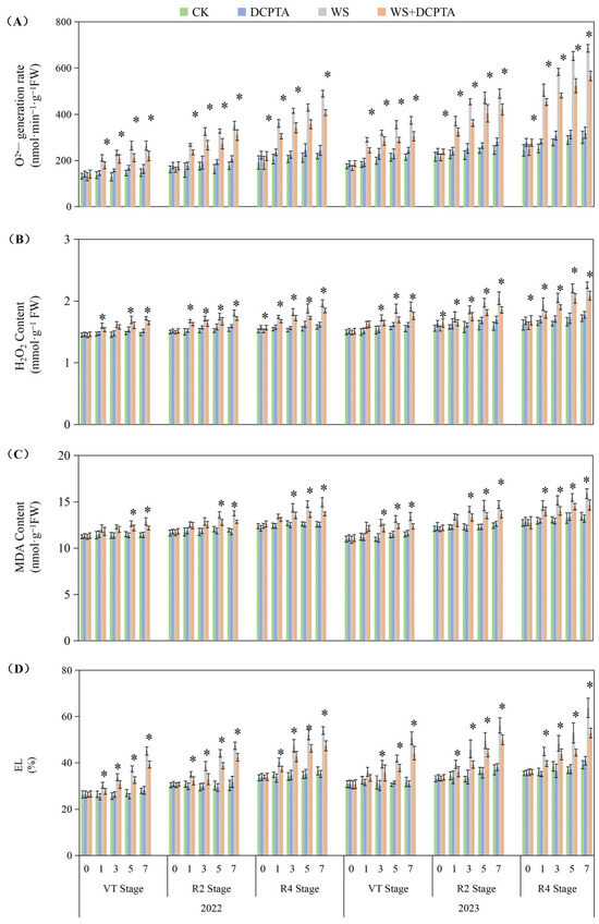 Responses of O2− generation rate (A), H2O2 content (B), MDA content (C) and EL (D) to post-tasseling waterlogging and exogenous DCPTA regulating effect. The data represent the means of independent measurements with five replicates, and the standard deviations are indicated by the vertical error bars. “*” on the bars indicates significant difference at p < 0.05 (LSD test) between the waterlogging and waterlogging with DCPTA at each time point.