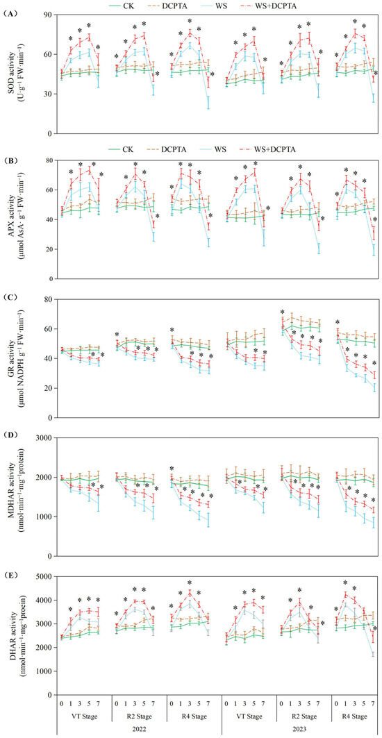 Responses of activities of SOD (A), APX (B), GR (C), MDHAR (D) and DHAR (E) to post-tasseling waterlogging and exogenous DCPTA regulating effect. The data represent the means of independent measurements with five replicates, and the standard deviations are indicated by the vertical error bars. “*” on the bars indicates significant difference at p < 0.05 (LSD test) between the waterlogging and waterlogging with DCPTA at each time point.