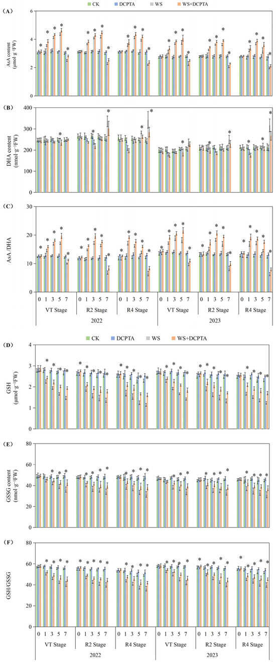The DCPTA treatment significantly enhanced the magnitude of the increase in AsA content and attenuated the magnitude of the decrease in DHA content during the early stage of waterlogging, moreover, it mitigated the decline in AsA content and restrained the elevation in DHA content during the late stage of waterlogging. Ultimately, it amplified the increase in the AsA/DHA ratio in the early stage while reducing its decrease in the late stage. For VT, R2 and R4 stages, the largest decreases on the 7th day down from 17.25%, 41.16% and 46.70% to 6.92%, 27.15% and 30.77% in 2022; from 27.20%, 36.75% and 49.08% to 16.84%, 23.61% and 35.59%. The DCPTA treatment effectively attenuated the magnitude of the decrease in the contents of GSH and GSSG during the waterlogging stage. Furthermore, it mitigated the decline in the ratio of GSH/GSSG. Under non-stress conditions, treatment with DCPTA resulted in an increase in the levels of both GSH and GSSG, leading to an elevation in the ratio of GSH/GSSG. For VT, R2 and R4 stages, the largest decreases on the 7th day down from 26.17%, 25.94% and 25.81% to 17.57%, 17.31% and 14.21% in 2022; from 26.23%, 26.78% and 22.79% to 18.59%, 18.41% and 12.18% in 2023.