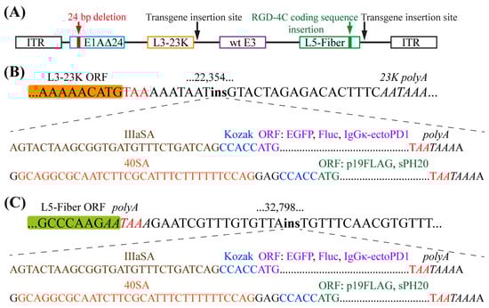 We previously reported the generation de novo [] of Ad5-delta-24-RGD (or Ad5∆24RGD herein), which is an E1AΔ24-based [,] infectivity-enhanced E3 region non-deleted OAd with the insertion of the arginine–glycine–aspartic acid (RGD) motif-containing integrin-targeting peptide RGD-4C in the HI loop of the fiber knob domain [] (Figure 1A). Ad5∆24RGD (DNX-2401, tasadenoturev) has been tested in phase I/II clinical trials in patients with high-grade glioma and presented a favorable toxicity profile [,,,]. We used Ad5∆24RGD as a platform to incorporate five transgenes: EGFP (total of 239 amino acid residues, aa), firefly luciferase (Fluc, total of 550 aa), the suppressor of RNA silencing p19 of tomato bushy stunt virus (Tombusvirus genus) with a C-terminal FLAG tag (p19FLAG, total of 180 aa), the soluble ectodomain of human programmed cell death receptor-1 (hPD-1/PDCD1, 26–147 aa) with the native signal peptide (1–25 aa) replaced by the murine immunoglobulin kappa (IgGκ) light chain signal peptide (total of 142 aa), and the soluble C-terminal truncated (20 aa) hPH20/SPAM1 (total of 489 aa). All the transgenes were inserted into a cassette containing 40SA (for p19FLAG and hPH20; GC3%, 38.3%, and 35.8%, respectively) or IIIaSA (for EGFP, Fluc, and IgGκ-ecto-hPD1; GC3%, 97.1%, 49.6%, and 83.1%, respectively), a Kozak consensus sequence, and a poly(A) signal sequence overlapping with a stop codon (Table S1) downstream of the L3-23K [] and L5-Fiber [] regions at sites corresponding to nucleotides 22,354 (Figure 1B) and 32,798 (Figure 1C), respectively, of the wild-type Ad5 genome.