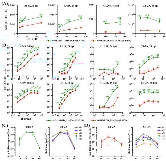 We first quantitatively compared the activity of the EGFP and Fluc transgenes inserted downstream of the L3-23K and L5-Fiber regions. A flow cytometry analysis of human lung adenocarcinoma A549 and glioblastoma LN18 cells at 24 h postinfection (hpi) and murine glioma GL261 and CT-2A cells at 48 hpi with serial dilutions of Ad5Δ24RGD_IIIa-EGFP (L3-23K) and Ad5Δ24RGD_IIIa-EGFP (L5-Fiber) revealed that the median fluorescence intensity (MFI) of EGFP expressed downstream of the L3-23K region was on average 1.6–1.8-fold higher in A549 cells, 2.6–3.2-fold higher in LN18 cells, 6.7–9.1-fold higher in GL261 cells, and 5.0–5.8-fold higher in CT-2A cells (Figure 2A). We confirmed these observations by analyzing the luminescence intensity (relative light units [RLUs]) of cells infected with serial dilutions of Ad5Δ24RGD_IIIa-Fluc (L3-23K) and Ad5Δ24RGD_IIIa-Fluc (L5-Fiber) (Figure 2B). The RLU for Fluc expressed downstream of the L3-23K region was on average 3.7–15.3-fold higher at 24 hpi and 2.3–5.2-fold higher at 48 hpi in A549 cells, 4.3–14.5-fold higher at 24 hpi and 1.9–6.5-fold higher at 48 hpi in LN18 cells, 4.3-fold higher at 24 hpi and 19–91-fold higher at 48 hpi in GL261 cells, and 5–47-fold higher at 24 hpi and 17–44-fold higher at 48 hpi in CT-2A cells (Figure 2B). Thus, although both the L3-23K and L5-Fiber regions are under the control of the MLP, and IIIaSA was used to express both reporter transgenes, the activity of EGFP and Fluc inserted downstream of the L3-23K region was considerably higher than that of EGFP and Fluc inserted downstream of the L5-Fiber region in both human and mouse tumor cells.