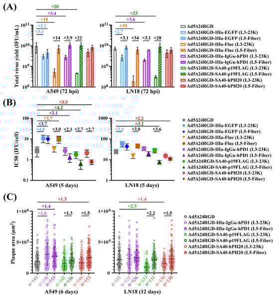 The mean sizes of plaques stained with the vital dye thiazolyl blue tetrazolium bromide (MTT) were considerably reduced for OAds with 40SA-p19FLAG (L3-23K) and 40SA-hPH20 (L3-23K) insertions but only in LN18 cells (Figure 3C). Interestingly, the mean sizes of plaques were considerably increased for OAds with IIIa-IgGκ-ecto-hPD1 (L3-23K), IIIa-IgGκ-ecto-hPD1 (L5-Fiber), and 40SA-hPH20 (L5-Fiber) insertions but only in A549 cells (Figure 3C). OAds with IIIa-EGFP and IIIa-Fluc insertions did not form MTT-stained plaques that could be accurately quantified by Day 6 in A549 cells or by Day 12 in LN18 cells. In contrast, previously generated Ad5Δ24RGD_E1B55K-p2A-EGFP and Ad5Δ24RGD_DBP-p2A-EGFP [] with the EGFP coding sequence fused to the C-terminus of E1B-55K or DBP via a p2A peptide formed MTT-stained plaques of similar mean size to the parental virus (Figure S2A). An analysis of the size of the fluorescent plaques revealed that the spread of Ad5Δ24RGD_E1B55K-p2A-EGFP and Ad5Δ24RGD_DBP-p2A-EGFP was considerably more efficacious than that of Ad5Δ24RGD_IIIa-EGFP (L3-23K) and Ad5Δ24RGD_IIIa-EGFP (L5-Fiber), with Ad5Δ24RGD_IIIa-EGFP (L3-23K) exhibiting the lowest spread efficacy (Figure S2B). Finally, the mean sizes of the MTT-stained plaques formed by OAds with IIIa-EGFP and IIIa-Fluc insertions downstream of the L3-23K region were considerably smaller than those formed by OAds with insertions downstream of the L5-Fiber region in A549 cells on Day 10 (Figure S2C).