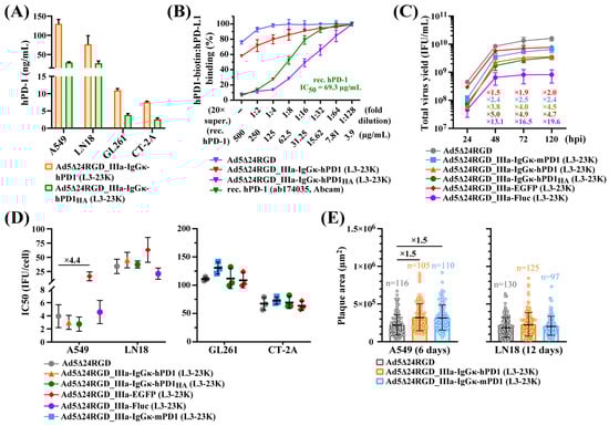 An analysis of the kinetics of reproduction showed that the total virus yield at 48–120 hpi was on average 1.5–2.0-, 2.4–2.5-, 3.8–4.5-, 4.7–5.0-, and 13.1–19.6-fold lower for OAds with IIIa-EGFP, IIIa-IgGκ-ecto-mPD1, IIIa-IgGκ-ecto-hPD1, IIIa-IgGκ-ecto-hPD1HA, and IIIa-Fluc insertions, respectively, than for the parental virus Ad5Δ24RGD (Figure 4C). However, in human cells, the cytolytic efficacy was considerably reduced only for Ad5Δ24RGD_IIIa-EGFP (L3-23K) and only in A549 cells (4.4-fold higher IC50 value), whereas no substantial differences were observed between the parental virus and OAds producing the mPD-1 or hPD-1HA ectodomains or EGFP in murine glioma cells (Figure 4D). Finally, we found that the insertion of not only IIIa-IgGκ-ecto-hPD1 but also IIIa-IgGκ-ecto-mPD1 considerably increased the size of plaques in A549 cells but had no effect on the size of plaques in LN18 cells (Figure 4E).