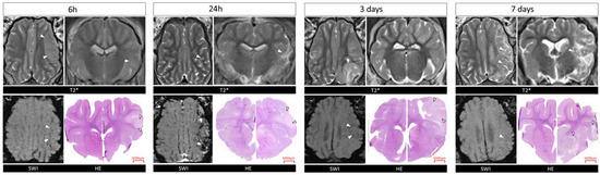 MRI and histological evaluation of stroke in Pig brains at 6 h, 24 h, 3 and 7 days. T2w SWI scans and HE images of brain tissue at different time points. White arrows indicate the site of the stroke. T*-T2 weighted scans.