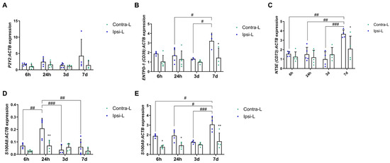 Gene expression of P2Y2 (A), ENTPD-1 (CD39) (B), NT5E (CD73) (C) and calcium-binding proteins—S100A8 (D) and S100A9 (E)—in the ipsilateral (ipsi-L, green spots) and contralateral (contra-L blue squares) hemisphere 6 h, 24 h, 3 days and 7 days after the onset of stroke. Statistical analysis: * p < 0.05, ** p < 0.01 (ipsilateral vs. contralateral hemisphere); # p < 0.05, ## p < 0.01, ### p < 0.001 (comparison between time points). Data are presented as mean ± SEM.