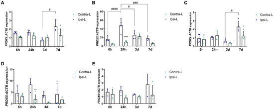 Gene expression of peroxiredoxins PRDX1 (A), PRDX2 (B), PRDX4 (C), PRDX5 (D) and PRDX6 (E) in the ipsilateral (ipsi-L, green spots) and contralateral (contra-L, blue squares) hemisphere 6 h, 24 h, 3 days and 7 days after the onset of stroke. Statistical analysis: * p < 0.05, ** p < 0.01, **** p < 0.0001 (ipsilateral vs. contralateral hemisphere); # p < 0.05, ### p < 0.001, #### p < 0.0001 (comparison between time points). Data are presented as mean ± SEM.