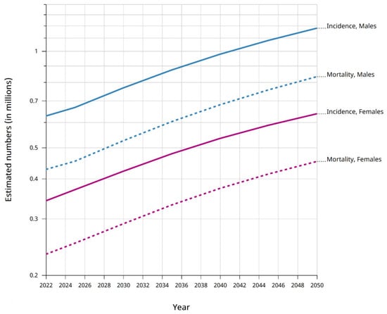 - Cancer Tomorrow. Available online: https://gco.iarc.fr/tomorrow/en/dataviz/trends?multiple_populations=1&cancers=7 (accessed on 12 February 2024).