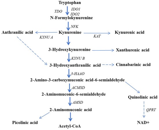 The KP is responsible for >95% of TRP degradation (Figure 2) and leads to de novo synthesis of NAD+ and NADP+ []. The first step in the KP is cleavage of the indole ring of TRP and its conversion to N′-formykynurenine (NFK), mediated by IDO1, IDO2, and TDO. In particular, IDO1 and TDO are essential factors in immune regulation []. TDO (formerly tryptophan pyrrolase) is normally expressed almost exclusively in the liver and is responsible for ~90% of the total degradation of TRP under normal physiological conditions []. The extrahepatic KP, regulated by IDO isoforms, contributes only <2% to this process under normal conditions, but is significantly enhanced after immune activation. N′-formylkynurenine is hydrolyzed to kynurenine (KYN), identified as a specific agonist of the human aryl hydrocarbon receptor (AHR), activation of which promotes invasiveness and accelerates growth of cancer cells []. Further, in the KP, KYN is mainly hydrolyzed by kynurenine monooxygenase (KMO) to 3-hydroksykynurenine (3HKYN), which can be transformed into xanthuerenic acid (XA) by kynurenine aminotransferase (KAT). Alternately, KYN can be metabolized to kynurenic acid (KYNA) by kynurenine aminotransferase or anthranilic acid (AA) by kynureninase []. Another downstream KP metabolite, 3-hydroxyanthranilic acid (3HAA), can be produced from AA through a non-enzymatic reaction or from 3HKYN by the activity of kynureninase B. In the next step, 3HAA is transformed into 2-amino-3-carboxymuconic acid-6 semialdehyde (ACMS) by 3-hydroxyanthranilic acid-3,4-dioxygenase (3-HAAO) or oxidized to cinnabarinic acid (CA). At this stage, the KP branches into two arms. ACMS is rapidly converted to quinolinic acid (QA) by the non-enzymatic reaction or to 2-aminomuconic semialdehyde (AMS) []. In the KP, QA is further processed by QA phosphoribosyl transferase (QPRT) to the precursor nicotinic acid mononucleotide (NAMN) and then to NAD+ []. AMS is transformed to picolinic acid (PIC) by non-enzymatic cyclization or 2-aminomuconic acid by 2-aminomuconate semialdehyde dehydrogenase, which can be further degraded to acetyl-CoA [].