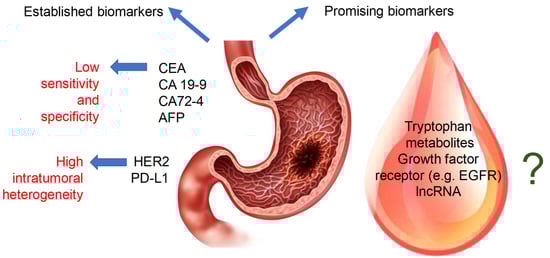 In clinical practice, only a few biomarkers are used for the early detection of GC, but their specificity and sensitivity are insufficient, thus requiring several markers to be tested simultaneously []. Carcinoembryonic antigen (CEA) is a nonspecific serum biomarker, since it appears at elevated levels in different malignant cancers, including colorectal cancer, medullary thyroid cancer, breast cancer, mucinous ovarian cancer, pancreatic cancer, lung cancer, and advanced stages of GC. Therefore, the monitoring of serum CEA is not effective for routine screening []. Other serum tumor markers, carbohydrate antigens (e.g., CA19-9, CA72-4, CA125), are widely applied in diagnosis, evaluation of treatment effects, and disease monitoring. CA19-9 is the most popular marker used in gastroenteric cancer, and its elevated level is associated with advanced stage, differentiated histology, and a higher percentage of lymph node metastases []. Patients with GC have high serum levels of CA72-4, which increase as the disease progresses. Treatment effectiveness and GC relapses can be monitored with this marker. However, the role of CA72-4 as a screening marker for GC remains unclear []. The prognostic and diagnostic significance of AFP and CA125 is of little importance, since their levels are relatively low in early GC []. However, they become more important in patients with GC who have metastases and a poor prognosis.