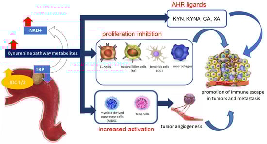 KYN plays a special role in this process, as it is an AHR ligand. AHR belongs to the basic helix–loop–helix–(bHLH) superfamily of transcription factors [], which regulates biological processes responsible for maintaining tissue homeostasis or contributing to inflammation and cancer development []. Activation of KYN-AHR is correlated with enhanced levels of inflammatory cytokines (IL-1β, IL-6, IL-8) and a decrease in the number of infiltrating CD8+ cells around tumors. In the microenvironment, the persistence of elevated inflammatory cytokines causes chronic IDO1 expression in antigen-presenting cells (APC) such as macrophages, dendritic cells (DC), and/or tumor cells []. Overexpression of IDO1 leads to increased production of KP metabolites in the local cancer microenvironment, and consequently activation of AHR, which results in initiation of tumorigenesis by suppressing antitumor immune responses and promoting tumor cell survival and motility (Figure 4). However, immunosuppression caused by activation of the KYN-AHR pathway is accompanied by different mechanisms that arrest the production of effector T cells, promote IL10 production (potent anti-inflammatory cytokine), and enhance the proliferation of Treg cells, which support immune escape from cancer cells []. Notably, KYN is a precursor for other ligands for the AHR receptor (KYNA, XA, CA) []. AHR-KYN activation has been confirmed in human brain tumors, melanoma, renal cancer, B-cell lymphoma, Ewing sarcoma, bladder carcinoma, cervix carcinoma, colorectal carcinoma, lung carcinoma, and ovarian carcinoma, and is associated with tumor progression and drug resistance [].
