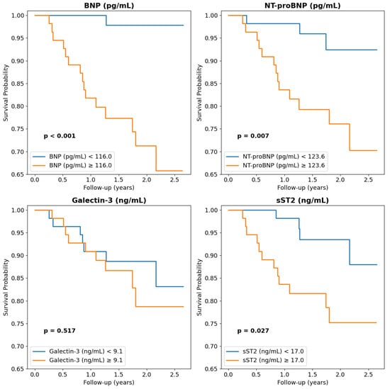 - Bayes-Genis, A.; de Antonio, M.; Vila, J.; Peñafiel, J.; Galán, A.; Barallat, J.; Zamora, E.; Urrutia, A.; Lupón, J. Head-to-Head Comparison of 2 Myocardial Fibrosis Biomarkers for Long-Term Heart Failure Risk Stratification. J. Am. Coll. Cardiol. 2014, 63, 158–166. [Google Scholar] [CrossRef] [PubMed]
