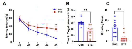 2.1. AD Model Rats Induced by STZ Show Cognitive Dysfunction