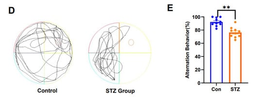 Cognitive dysfunction in STZ-treated model rats. Morris water maze test and Y-maze test (n = 10/group). (A) Escape latency during the first 5 days; (B) Number of times the rats crossed the target quadrant; (C) Percentage of time in the target quadrant in both groups; (D) Representative swim paths in the test session on day 6. * p < 0.05, ** p < 0.01 compared with control); (E) Y-maze experiment alternating the correct rate of rats (** p < 0.01 compared with the control).