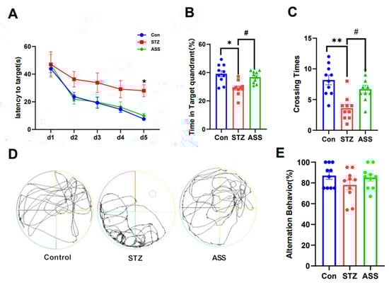 Effect of ASS on the cognitive ability of STZ-treated rats. Morris water maze test and Y-maze test (n = 10/group). (A) Average escape latency in the first 5 days; (B) The number of times each group of rats crossed the platform; (C) The percentage of time in the target quadrant for each group of rats; (D) Representative trajectory maps of spatial exploration for each group of rats. * p < 0.05, ** p < 0.01 compared with the control group. # p < 0.05 compared with STZ-treated rats; (E) Y-maze experiment alternating the correct rate of rats (* p < 0.05 compared with the control group).