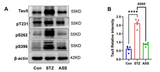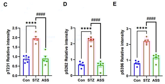 Effect of ASS on the expression of pT231, pSer262, pSer396, and Tau5 in the hippocampal region of STZ-treated rats. (A–E) Expression of Tau5, pT231, pSer262, and pSer396 proteins in the hippocampal region (n = 5). **** p < 0.001 compared with the control group. #### p < 0.001 compared with the STZ + ASS group.