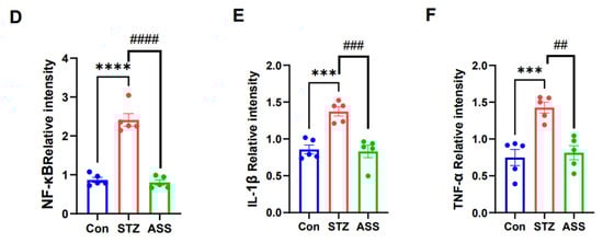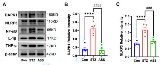 Death-associated protein kinase 1 (DAPK1) is a protein kinase that phosphorylates serine and threonine residues at protein sites, and our group demonstrated that DAPK1 phosphorylates the Tau protein, leading to cognitive decline in the mouse models of AD. Therefore, the expression of DAPK1 and the related protein in the hippocampal region was detected using Western blotting. The molecular estimates of DAPK1, NLRP3, NF-κB, lL-1β, and TNF-α were statistically significantly different (F(2,12) = 36.23, F(2,12) = 23.13, F(2,12) = 70.81, F(2,12) = 18.97, and F(2,12) = 15.77). And it was found that the protein expression of rats in the ASS group was significantly decreased (p < 0.001) compared with that in the STZ-treated rats (Figure 5A,B). However, the expression of some inflammation-related markers—NLRP3 (p < 0.001), NF-κB (p < 0.001), lL-1β (p < 0.001), and TNF-α (p < 0.001)—appeared consistent with the expression of DAPK1 (Figure 5A,C–F), suggesting that elevation of DAPK1 might be associated with the altered expression of inflammatory factors.