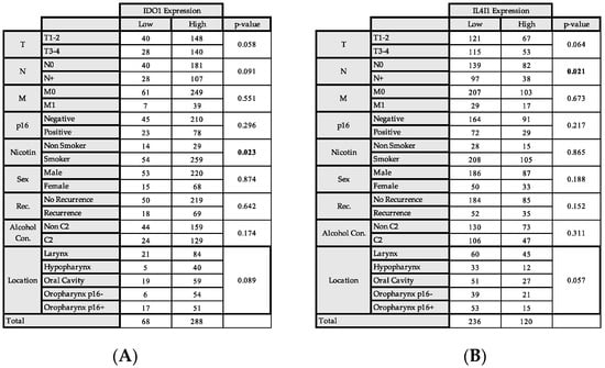 2.1. The Expression of IDO1 and IL4I1 and Association with Clinicopathologic Characteristics