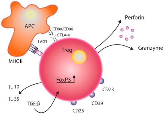 Grossman W et al. proposed that Treg cells likely exert their suppressive effects through various mechanisms. Research has demonstrated that activated regulatory T cells have the ability to eliminate effector cells or antigen-presenting cells by releasing perforin and granzymes [10]. Tregs may interact with APC functionally via co-stimulatory molecules (CD80/CD86, CTLA-4) expressed on the surface of dendritic cells (DCs) ([11], Figure 1). In addition, soluble factors, such as IL-10, IL-35, TGF-β, and LAG3, also modulate Tregs functions [12,13]. Regulatory T cells expressing FoxP3 and ICOS can inhibit T cells and dendritic cells by releasing cytokines TGF-β and IL-10, respectively [14]. Furthermore, Tregs expressing HLA-DR molecules can stimulate early contact-dependent inhibition [15]. Akkaya et al. [16] demonstrated that antigen-specific Tregs can downregulate the antigen-presenting capabilities of DCs by depleting peptide–MHC II on their surface. This process is noteworthy for its antigen specificity and represents a novel mechanism in regard to Tregs’ suppressive function.