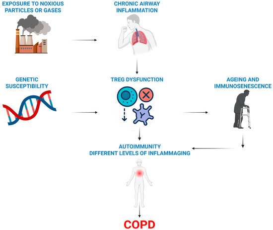 Figure 2. Overview of the immune hypothesis of COPD. Treg dysfunction (a lack or their impaired activity) combined with a genetic predisposition promotes autoimmune and ageing processes in smoking-damaged lungs and causes COPD.