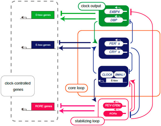 Schema of the feedback loop of the transcriptional regulation of clock genes. Core loop (orange square): CLOCK and BMAL1 proteins form a heterodimer and bind to the E-box, enhancing the expression of PERs and CRYs. Translated PERs and CRYs suppress their own gene expression by inhibiting CLOCK-BMAL1-mediated transcription. Stabilizing loop (red square): The RORE sequence contains REV-ERBα as a transcriptional repressor and RORα as a transcriptional activator and controls transcription through the clock cis elements E-box and RRE. Clock output (green background): DBP and E4BP4 bind to the D-box as a transcriptional activator and transcriptional repressor, respectively, to control downstream clock-controlled genes. The core loop signal controls the expression of DBP, and the stabilizing signal controls the expression of E4BP4. The core loop and multiple regulatory subloops are expressed at different phases of the circadian cycle of transcriptional activation, producing peaks of gene transcriptional activity at various times throughout the day.