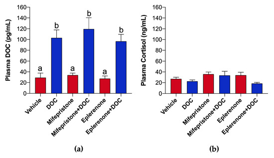 In plasma obtained from rainbow trout, significantly increased DOC levels were detected in the DOC-treated group (103 ± 14.95 pg/mL) vs. the vehicle group (29.34 ± 8. 34 pg/mL), mifepristone + DOC (119.5 ± 20.64 pg/mL) vs. mifepristone alone (34.04 ± 3.61 pg/mL), and eplerenone + DOC (96.73 ± 12.76 pg/mL) vs. eplerenone alone (27.59 ± 4.80 pg/mL) (Figure 1a). No significant changes in plasma cortisol concentrations were observed (Figure 1b).