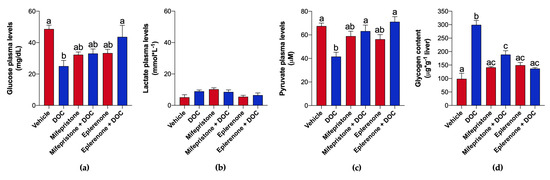 DOC-induced plasma glucose levels decreased significantly compared to the vehicle group (25.01 mg/dL ± 3.63; p = 0.0021; Figure 2a), which was reversed only when treated with eplerenone + DOC (43.66 mg/dL ± 7.351; p = 0.021), while no significant changes were observed when using the inhibitor mifepristone + DOC. Neither treatment resulted in significant changes in plasma lactate levels (Figure 2b). DOC compared to the vehicle group significantly decreased plasma pyruvate levels (41.59 ± 3.70 µM; p = 0.0012; Figure 2c), which was reversed when treated with mifepristone + DOC (63.17 ± 5.108 µM; p = 0.009) and eplerenone + DOC (71.11 ± 4.353 µM; p = 0.0002). As shown in Figure 2b, glycogen contents increased after DOC treatment vs. vehicle treatment (299.3 ± 16.43 μg·g−1; p < 0.0001), which were reversed upon treatment with both GR antagonist + DOC (188.9 ± 14.25 μg·g−1; p < 0.0001) and MR antagonist + DOC (137.0 ± 3.86 μg·g−1; p < 0.0001).