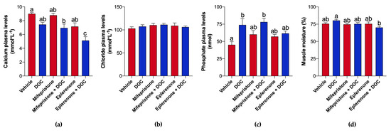 Plasma calcium levels decreased with DOC alone via MR (5.13 ± 0.55 mmol·L−1; p = 0.016, Figure 3a) compared to the DOC-only group; however, DOC treatment showed no significant change from the vehicle group. Plasma chloride levels did not show significant changes in all treatments (Figure 3b). While plasma phosphate levels increased significantly with DOC vs. the vehicle group (73.89 ± 9.20 nmol; p = 0.012), treatments with both receptor antagonists showed no changes (Figure 3c). The observed changes showed an increase in muscle moisture only between the eplerenone + DOC-treated group (70.19 ± 1.67%; p = 0.007) vs. DOC (Figure 3d).