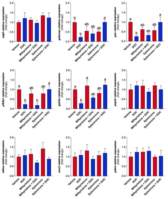 The mRNA levels of the gaa, gabarap, gsk3a, and pfkfb1 genes were significantly downregulated by DOC and upturned only via MR (Figure 4). No effects on atg9, pepck, eno3, pdk4, and aldoa were noticed in fish treated with DOC, mifepristone, or eplerenone plus DOC. Also, no transcriptional variations were detected by DOC through GR.