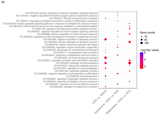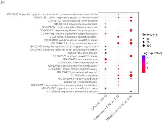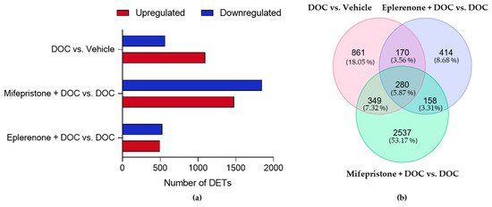 The RNA-seq analysis of DOC vs. vehicle comparison showed 1660 DETs, with 1095 upregulated and 565 downregulated. In the mifepristone + DOC vs. DOC comparison, 3324 DETs were detected, with 1478 upregulated and 1846 downregulated (Figure 5a). Finally, in the eplerenone + DOC vs. DOC comparison, 1022 DETs were detected, with 494 upregulated and 528 downregulated. The complete list of DETs is in Table S3. From 4769 unique DETs in total, a Venn diagram analysis between the three comparisons detected 280 shared DETs, 861 unique for DOC vs. vehicle, 2537 for mifepristone + DOC vs. DOC, and 414 for eplerenone + DOC vs. DOC (Figure 5b).