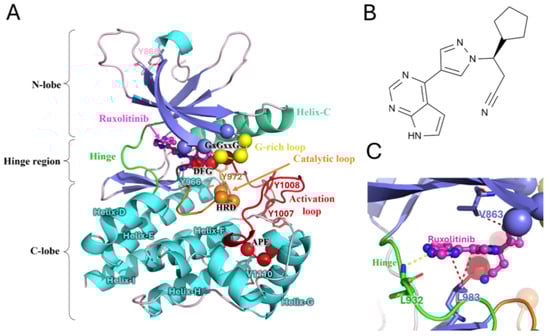 Visualization of the JH1 domain of JAK2 in complex with Ruxolitinib (PDB code: 6VGL). (A) JH1 subdomains: the activation loop (red), the catalytic loop (orange), the C-helix (teal blue), the G-rich loop (yellow), the hinge region (green), conserved motifs of JH1 (in spheres, the color depends on the region to which they belong), and the distribution of residues involved in the phosphorylation or interaction with Ruxolitinib (for the sticks, the color depends on the region in which they belong). Areas that do not belong to the indicated subdomains are colored according to the type of their secondary structure, as follows: ß-sheets (purple), α-helices annotated from D to I (cyan), loop (powder pink). (B) The chemical structure of Ruxolitinib. (C) The interaction of JH1 and the inhibitor Ruxolitinib identified by the PLIP (Protein-Ligand Interaction Profiler) []. Ruxolitinib is stabilized by hydrophobic interactions (red dashes) and hydrogen interactions (yellow dashes), the residues involved in these interactions are shown as sticks.