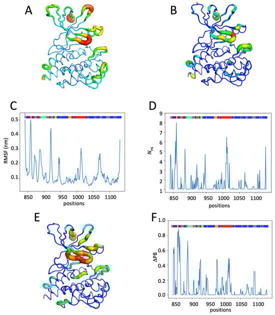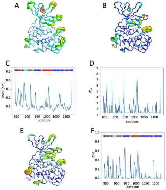 Analysis of the JH1 Ruxo-MultiPhosp system. (A) RMSF values and (B) Neq values of the Ruxo-MultiPhosp system. (C) RMSF values and (D) Neq values of the Ruxo-MultiPhosp system along the residue position. ΔPB between the Ruxo-pTyr1007 and Ruxo-MultiPhosp system (E) on the JH1 domain and (F) along the sequence (see the Figure 2 legend for more details).