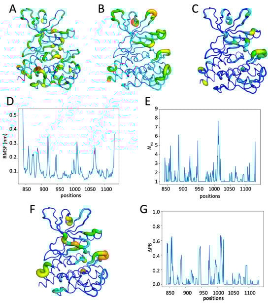 Figure 2 shows the dynamics analysis of all molecular dynamics simulations of the apo JH1 system, using RMSF (see Figure 2A,C and Figure S3A), Protein Blocks (see Figure 2E and Figure S4), and Neq (see Figure 2B,D and Figure S3A), arising from PBs. The system has a maximum RMSF at position 920, located in the loop between strands ß4 and ß5, for a fluctuation value about 4 Å. Two other flexible positions are located in the G-rich loop (positions 858–860) and in the activation loop (positions 1013–1014), with an RMSF greater than 3 Å. There is no position in the catalytic loop with an RMSF higher than 3 Å. The N-terminal part is mainly flexible because it is the beginning of the protein outside of most secondary structures.
