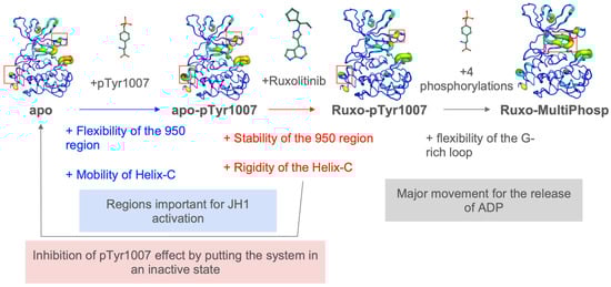 Figure 6 summarizes all the information obtained during this analysis (see also Figure S14 for an analysis of different clusters observed between systems). In the inactive, ligand-free state (apo), JH1 exhibits the high local flexibility of the activation loop (see Figure 2 and Figure S3). The mono-phosphorylation of residue Tyr 1007 (apo-pTyr1007) induces a slight stabilization of the loop, but it also induces a significant increase in the RMSF and Neq of the C-helix, as well as the Neq of the E-helix–D-helix loop around residue 950 (see Figure 3 and Figure S6). These differences in flexibility, that we can hypothesize are caused by the phosphorylation of Tyr 1007, could have an important impact on JAK2-JH1 activation, induced by the important role that the E-helix plays in the formation of the ATP binding site [,]. The helix movements caused by the flexibility of the loops could favor protein–protein or protein–substrate interactions.