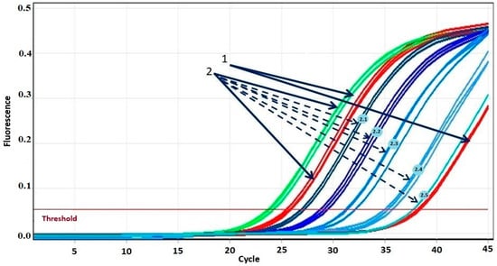 The sensitivity of the proposed system was evaluated by serial dilutions of the patient’s mutated DNA with the DNA of a healthy donor (Figure 1 and Figure 2). Figure 1 shows the amplification curves in the experiment with tenfold dilution from the first point using the DNA of a patient with the T315I mutation. The difference in threshold cycles between the amplification curves of the healthy donor DNA obtained in AS-PCR with primers for normal alleles (green curves in Figure 1, marked by arrow 1) and primers for detection of mutant alleles (red curves in Figure 1, marked by arrow 1) is equal to 15 cycles. Threshold cycles of DNA amplification curves with primer for mutation detection at a 105-fold dilution of patient DNA (blue curves in Figure 1, marked by dotted arrow 2.5) coincide with the threshold cycle of the corresponding curve of healthy donor DNA (red curves in Figure 1, marked by arrow 1). Thus, at an allele ratio of 0.003% or less, we may report the absence of mutant alleles. The threshold cycles of DNA amplification curves corresponding to a 104-fold dilution of the DNA of the patient with the mutation (blue curves in Figure 1, marked by the dotted arrow 2.4) reproducibly indicate the presence of the mutation. Consequently, at an allele ratio greater than 0.01%, we can confidently assert the presence of a mutation. Such sensitivity of T315I mutation detection is in full agreement with what is required for clinical diagnosis [19]. Similar results were obtained for other mutations.