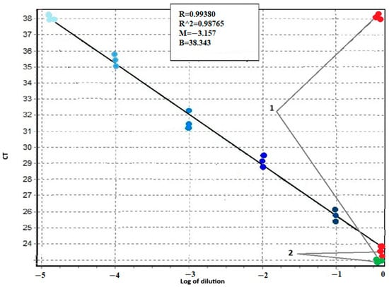 Calibration curve for determining the sensitivity of AS-PCR with primers detecting the T315I mutation of the BCR::ABL1 chimeric gene. The X-axis is the decimal logarithm of the sample DNA dilution. On the Y-axis is the value of the CT threshold cycle. 1—threshold cycles for AS-PCR DNA of a healthy donor 2—threshold cycles for AS-PCR DNA of a patient with T315I mutation (green dots refer to normal alleles, red—to mutant alleles). The color gradient from dark blue to light blue indicates the points corresponding to the threshold cycles of PCR amplification with mutant primers for consecutive tenfold dilutions of DNA of the patient with the T315I mutation in the DNA of a healthy donor.
