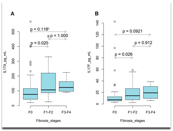 2.6. Associations Between Plasma Levels of IL17 Cytokines, TLR4, IL17 (A7488G, G197A), and TLR 4 (Asp299Gly, Thr399Ile) Gene Polymorphisms Stratified by Liver Fibrosis Stages