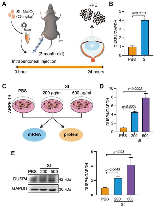 To validate this observation in an experimental model, we employed a well-established in vivo model, sodium iodate (SI)-induced retinal degeneration, which recapitulates key features of dry AMD through selective oxidative damage to RPE cells. Following intraperitoneal administration of SI, we observed progressive RPE cell loss over time (Figure 1A). Quantitative analysis of surviving RPE cells harvested 24 h post injection demonstrated significant elevation of DUSP4 mRNA levels compared to untreated controls (Figure 1B). Given the limited availability of primary murine RPE cells for protein-level analyses, we extended our investigation to the human ARPE-19 cell line. Cells exposed to SI (200 μg/mL or 500 μg/mL) for 24 h showed dose-dependent upregulation of DUSP4 expression (Figure 1C). DUSP4 was upregulated significantly at the mRNA level, particularly in the 500 μg/mL treatment group (Figure 1D). Consistent with these findings at protein levels, a 4-fold increase in DUSP4 expression was observed in high-dose-treated cells compared to controls (Figure 1E). These findings suggest that DUSP4 upregulation constitutes an adaptive response to oxidative stress in AMD pathogenesis.