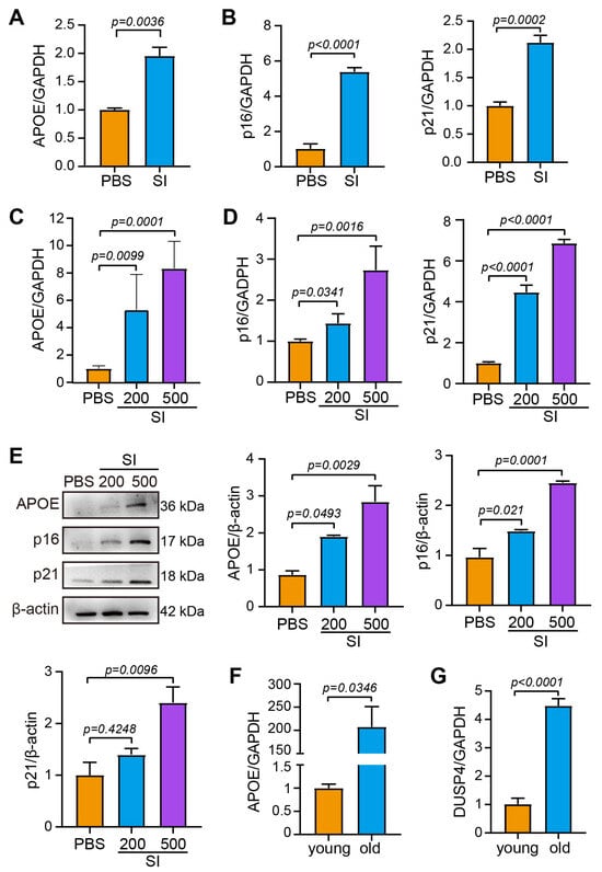 RPE senescence correlates with elevated DUSP4 expression. (A). APOE expression in mouse RPE 24 h after SI injection. (B). p16 and p21 expression in mouse RPE 24 h after SI injection. (C). APOE expression in ARPE-19 cells exposed to SI for 24 h. (D). p16 and p21 expression in ARPE-19 cells treated with SI for 24 h. (E). Protein expression of APOE, p16, and p21 in ARPE-19 cells 24 h after SI treatment. Band density was analyzed using ImageJ 1.48. (F). qPCR-quantified APOE expression in RPE from both young (10-week-old, n = 3) and old mice (15-month-old, n = 3). (G). qPCR-quantified DUSP4 expression in RPE of young and old mice.